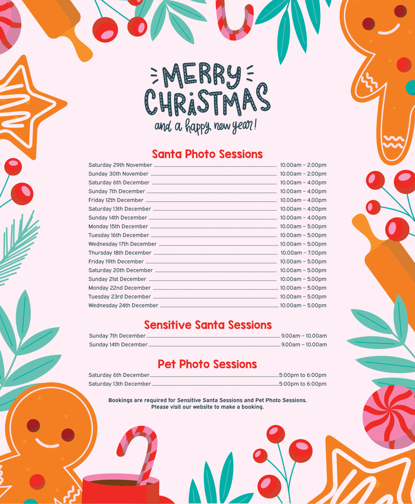 Santa photography is offered on select dates and times throughout the festive season. Please see Santa's Timetable below.
